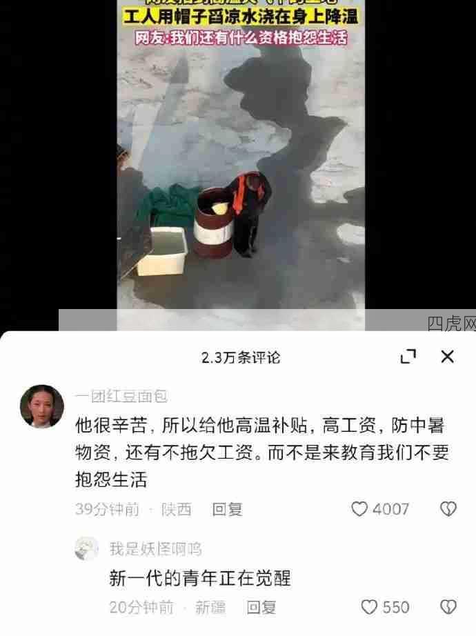 网友:他很辛苦,所以要给他高温补贴,高工资,防中暑物资,不拖欠工资。而不是来教育我们不要抱怨生活。@拚眭